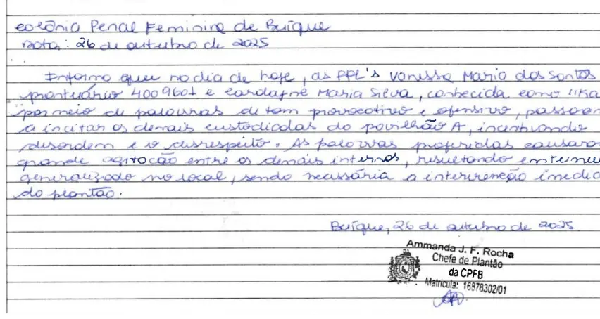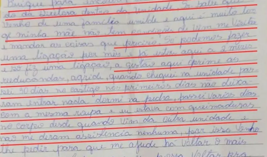 No texto, endereçado ao juiz José Andrade Saraiva Filho, da 1ª Vara Criminal da Comarca de Olinda (PE), ela pedia para ser transferida de volta ao Recife. “O presídio onde me encontro é muito longe e a mãe não tem condições de vir me visitar”, escreveu. Também reclamou do isolamento: “Estou aqui há dois meses e só fiz uma ligação”. E denunciou a gestão da unidade: “A gestão aqui oprime as reeducandas, agride”.